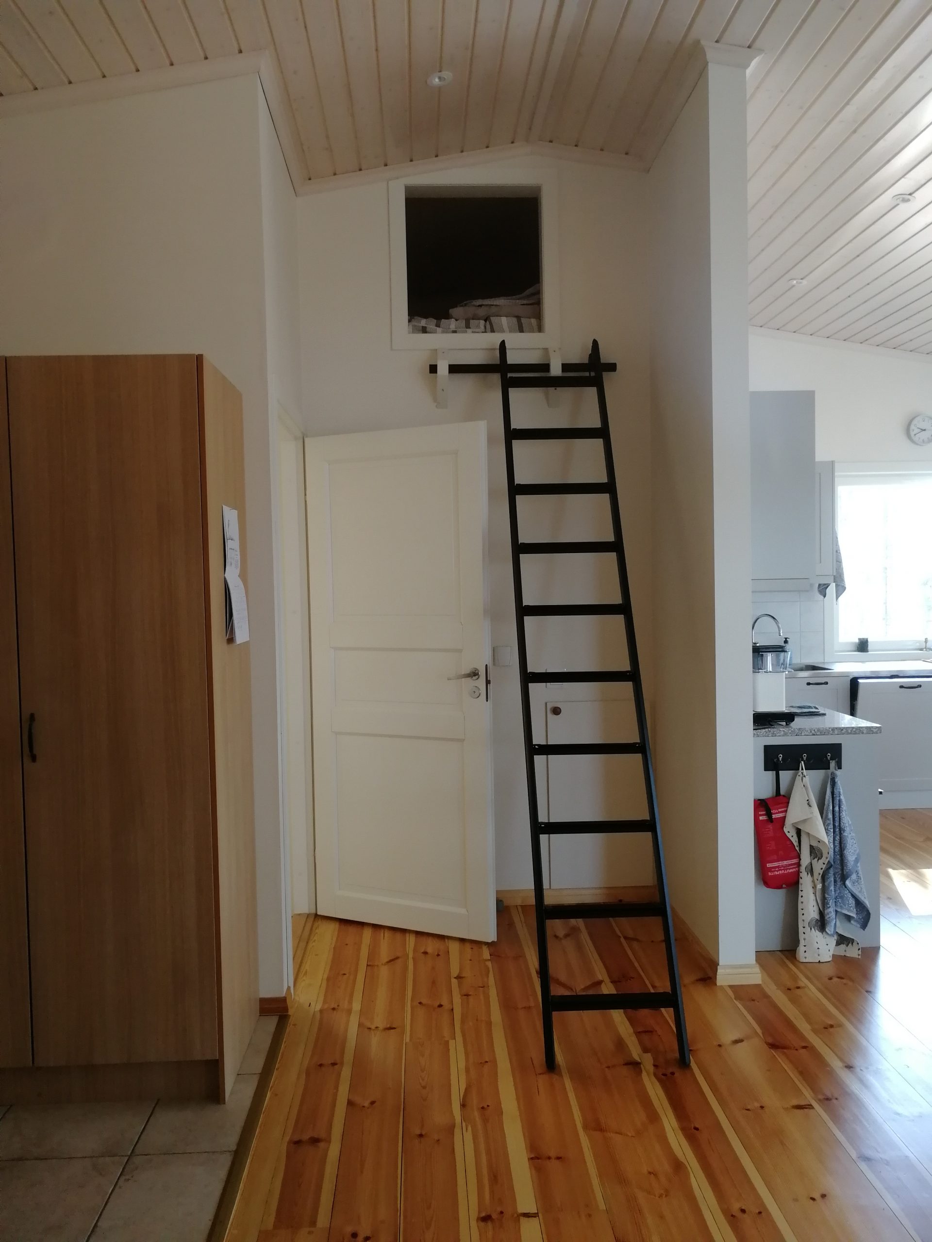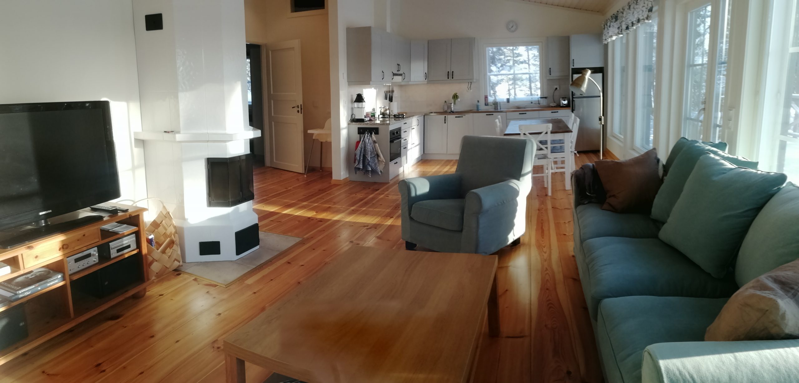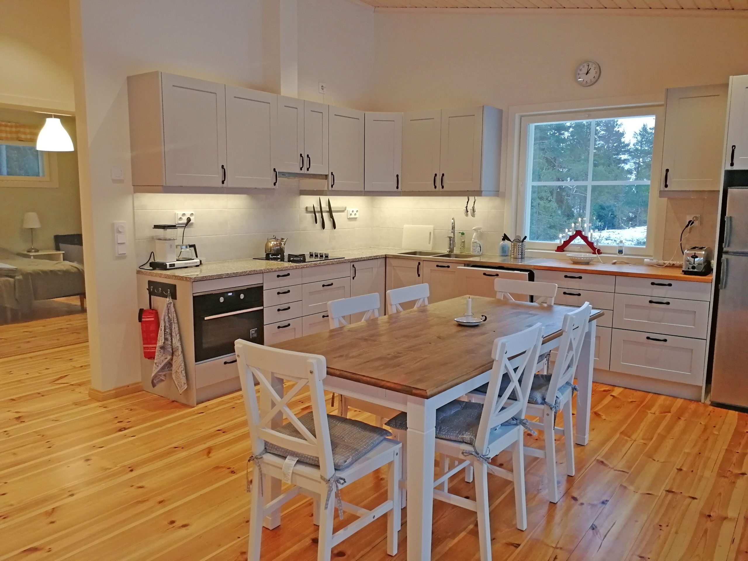 Keittiön varustelu: jääkaappipakastin, sähkö ja kaasuhella, tiskikone, uuni-mikroaaltouuni, kahvinkeitin, leivänpaahdin ja sähkövatkain. Lisäksi kaasugrilli.