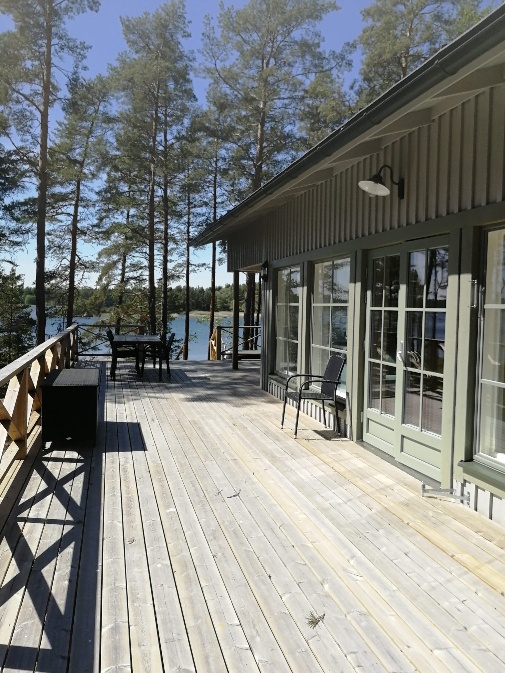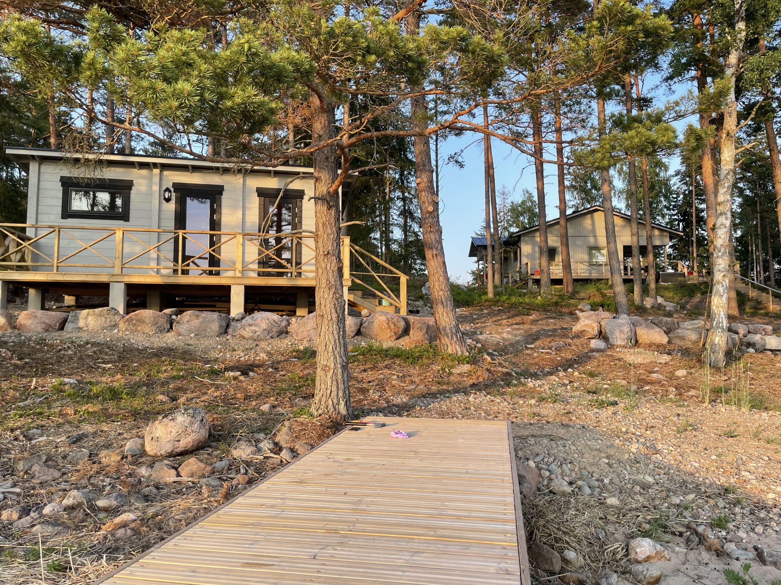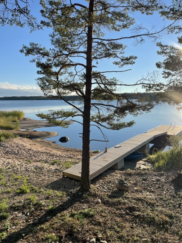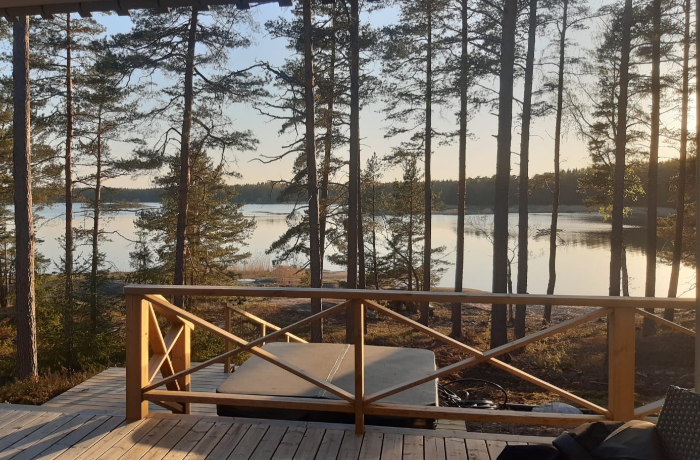Suurelta terassilta voit nauttia sekä auringonnoususta että -laskusta. Itään päin näkymä Hankoniemelle. Kesäksi 2022 valmistuu ranta. Rannassa tukevarakenteinen laituri ja uimaportaat.