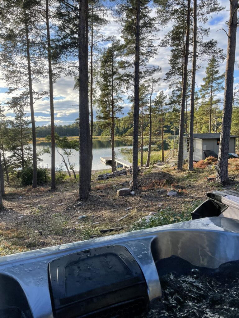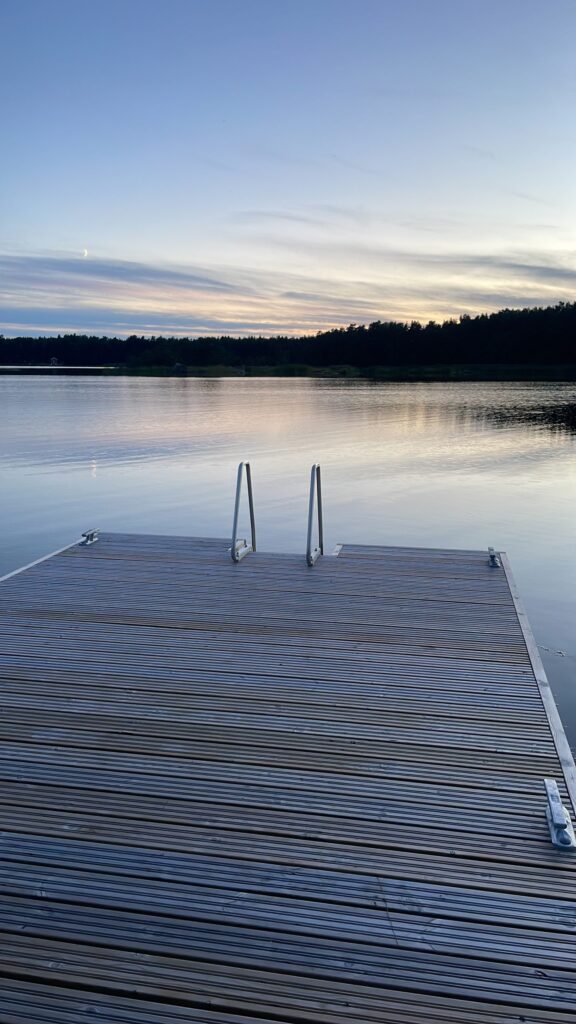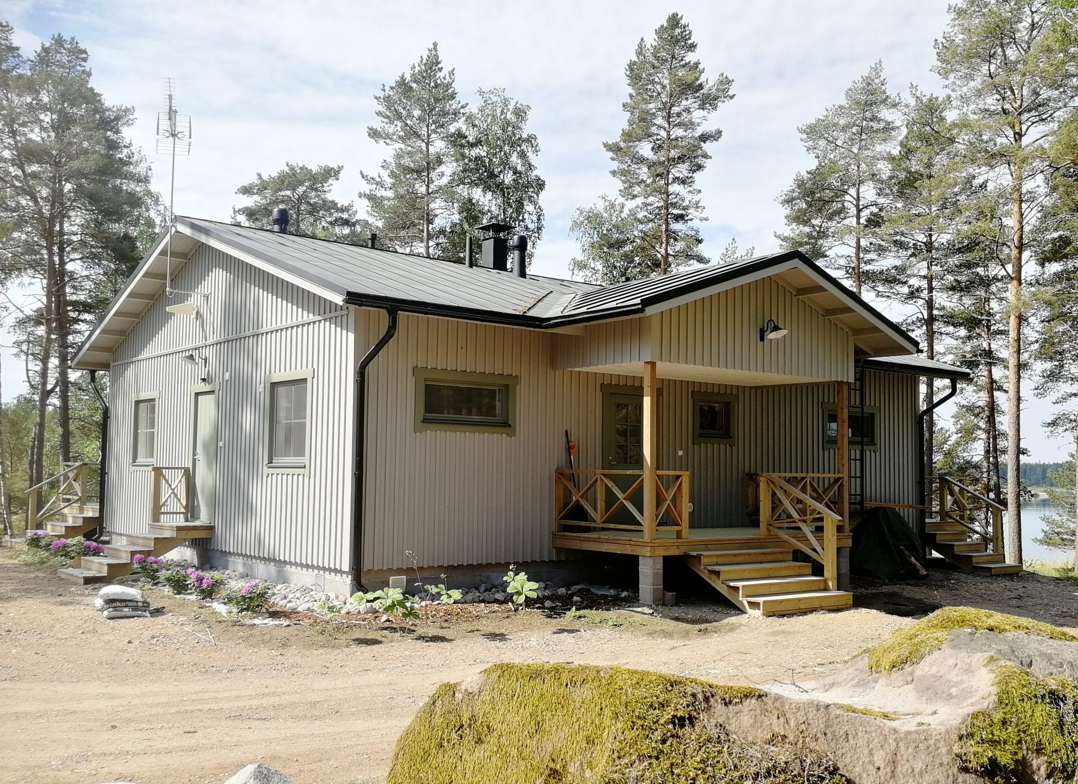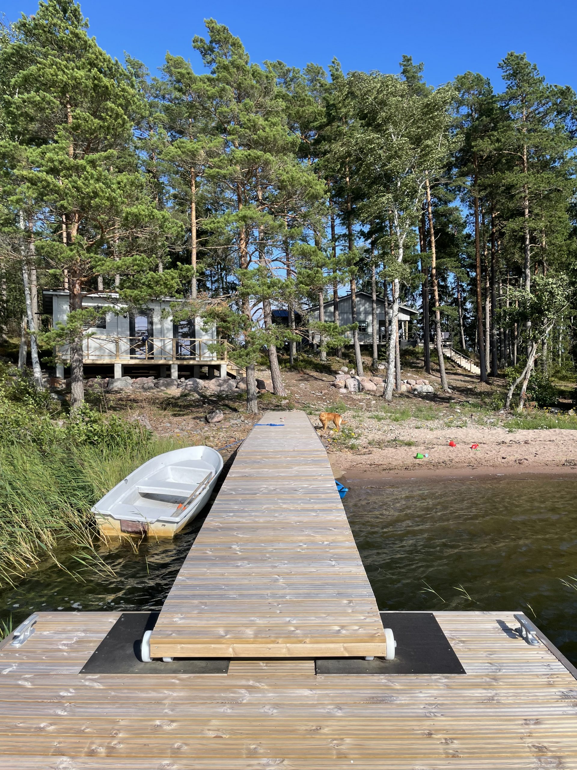 Suurelta terassilta voit nauttia sekä auringonnoususta että -laskusta. Itään päin näkymä Hankoniemelle. Kesäksi 2022 valmistuu ranta. Rannassa tukevarakenteinen laituri ja uimaportaat.